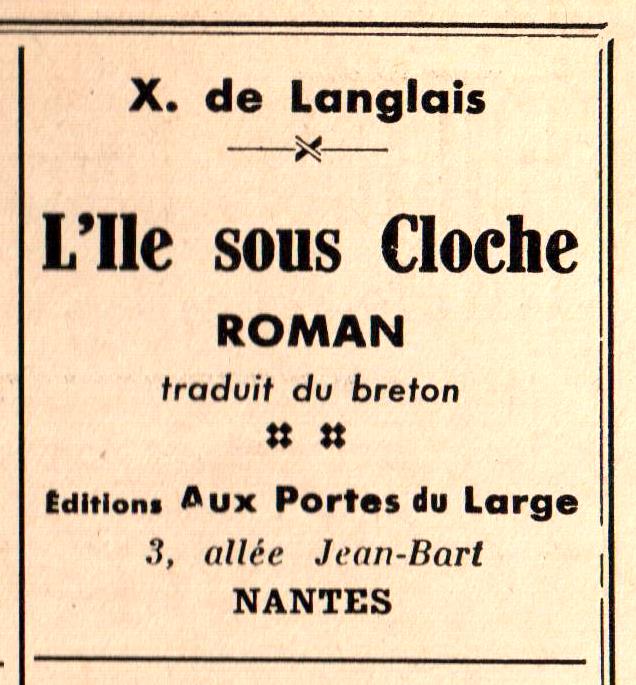 publicité encart en avant dernière page de couverture pour le roman “L’ile sous cloche” de Xavier de Langlais.